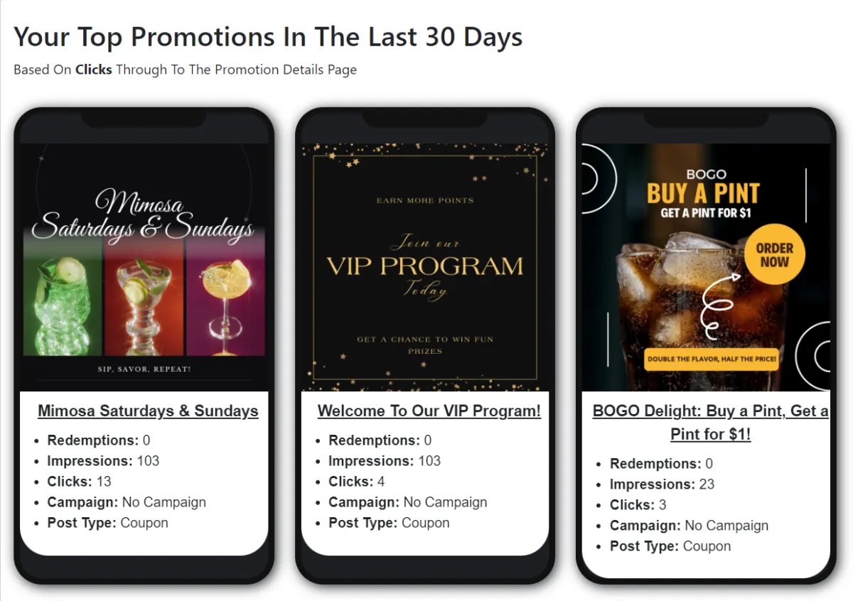Reporting is vital to any campaign. Having up to the minute campaign data so you know which promotions are the most popular, which are bringing in the most redemptions, and how you're getting your subscribers is going to help you make better decisions on how to market your restaurant.